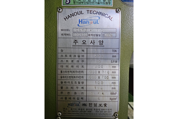 스트로크 수 : 55다이하이트 : 500 mm볼스타 면적 : 1300 x 760 mm슬라이드 면적 : 1050 x 700 mm슬라이드 조절량 : 100 mm
