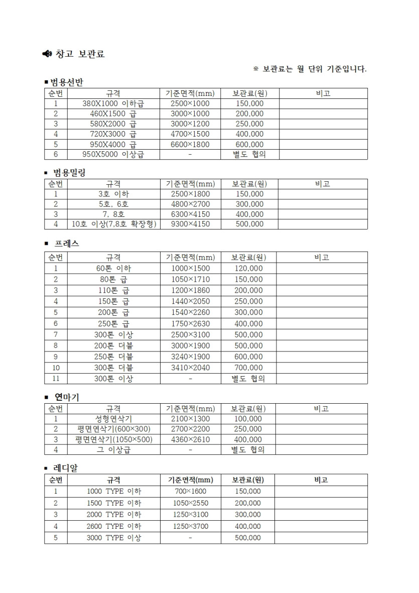 기계 보관창고 보관료 공지 작성자 정보 기계로닷컴 작성 작성일 2025.11.13 13:54 컨텐츠 정보 15 조회 목록 본문 조합원 여러분의 기계 보관 편의를 위해 아래 장소에 보관 창고를 오픈하오니 많은 이용 바랍니다. *창고주소 1) 경기도 시흥시 엠티브이북로 43-8 (약 250평) 2) 충남 아산시 인주면 해암리 3-75 (약850평, 보관료 50%할인) * 기계 개별보관 가능! 보관댓수에 따라 추가 할인 적용! *문의 담당: 임현우 전화: 010-8606-7124 관련자료 다음 '2025년 조합원 산행’ 취소 안내 작성일 2025.10.17 12:14 댓글 0 등록된 댓글이 없습니다. 로그인한 회원만 댓글 등록이 가능합니다. 목록