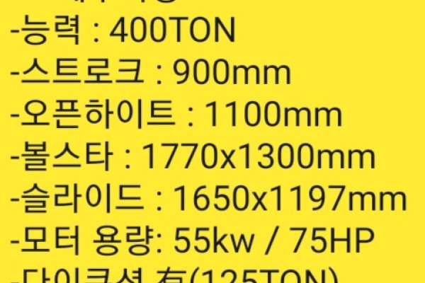 제품번호 : 1763170733 제품명 : 아진 유압프레스 400톤 - 다이쿠션有 (1994년) 모델명: 400톤 유압을 보고 궁금한 점이 있어서 문의 드립니다. 연락 부탁드립니다.